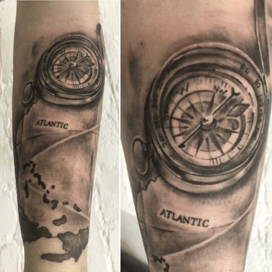 - Компас и «время» обычно тоже были связаны. Один из способов изобразить это — включить изображение часов или песочных часов на компас в дизайн татуировки. Карты и планета Земля также играют важную роль, поскольку, как и компасы, они помогают пользователю определять свое местоположение. Кто-то может сделать татуировку с компасом, когда хочет показать, что осознает, что у него мало времени на этой планете, и хочет быть уверенным, что собирается делать все, что захочет.