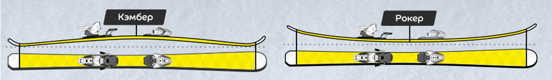 На всех горных лыжах есть прогиб. Чтобы понять, посмотрите на лыжу сбоку. Прогиб имеет две формы: кэмбер и рокер. Не будем углубляться в терминологию. Объясню просто. В рокере пятка и носок «задраны» вверх. В кембере они «прижаты» к снегу, а средняя часть лыжи приподнята. От формы прогиба зависит поведение лыж на горном склоне.