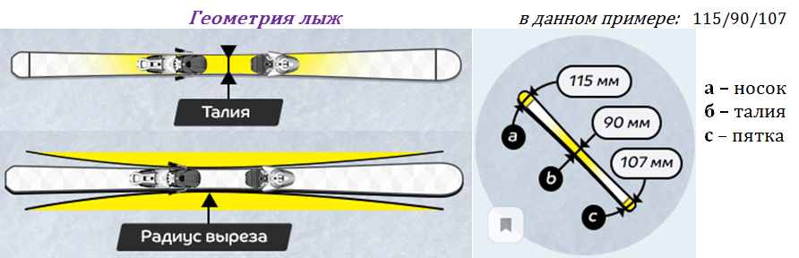 Радиус бокового выреза – это «размер» талии по отношению к ширине носка и пятки. В характеристиках размеры указывают в следующей последовательности: носок/талия/пятка. Рассмотрим на примере. В каталоге указана геометрия лыж: 121-73-103. Расшифровываем: ширина передней части – 121 мм; талии – 73 мм; пятки – 103 миллиметра.