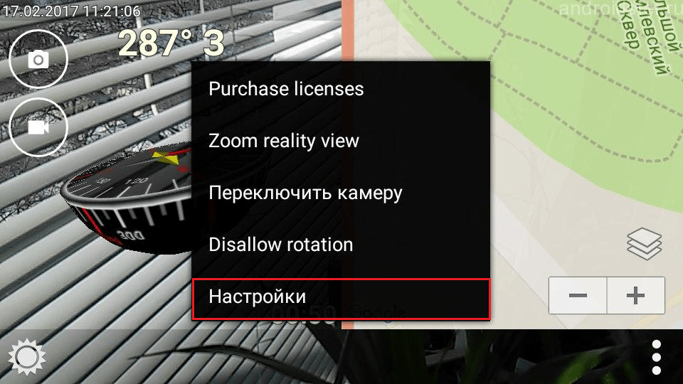 В основном меню Вы можете приобрести полную версию приложения, отрегулировать зум, переключить внешнюю камеру на фронтальную и обратно, а также зафиксировать компас в нужном Вам положении.