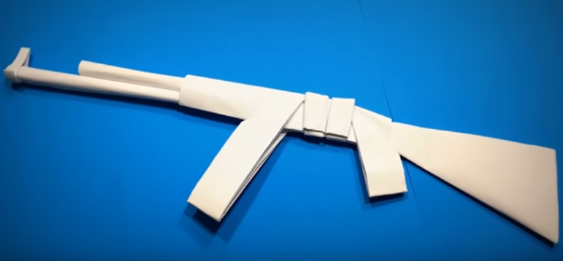 Наподобие этому, выше по тексту, мы описывали, как сделать пистолет оригами. Это самый простой способ. Если вам хочется повозиться, и есть желание сделать более правдоподобное оружие, то создайте автомат АК-47. Вот инструкция: