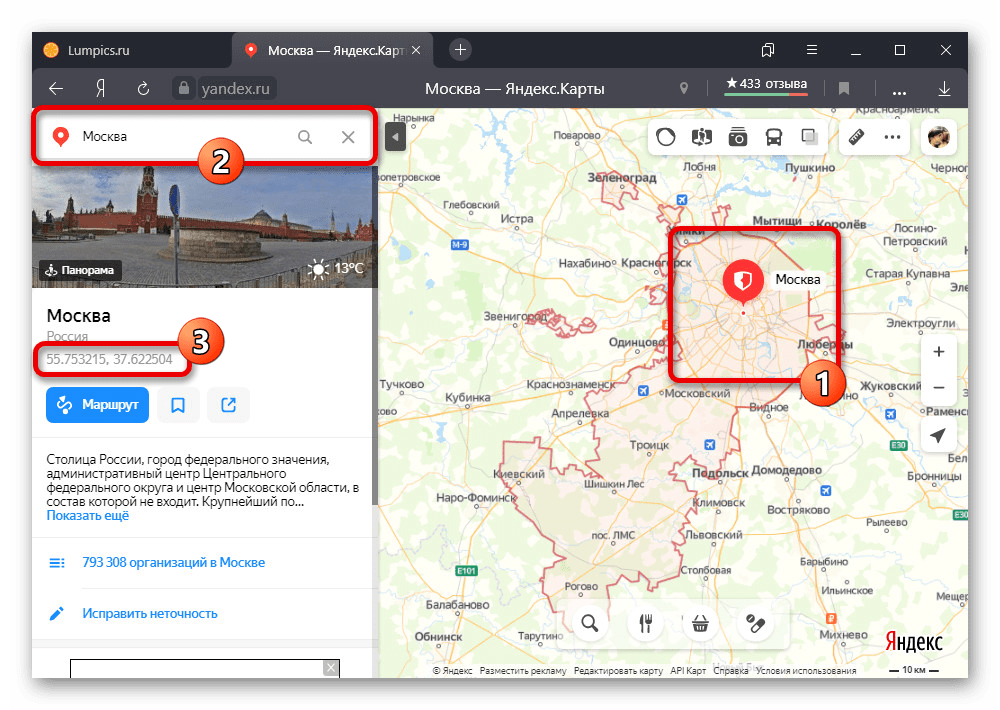Самый простой способ узнать координаты фиксированного объекта на карте заключается в использовании внутренней системы поиска. К примеру, введите название города в отмеченное текстовое поле, нажмите «Enter» на клавиатуре и внимательно ознакомьтесь с карточкой в правой части страницы.