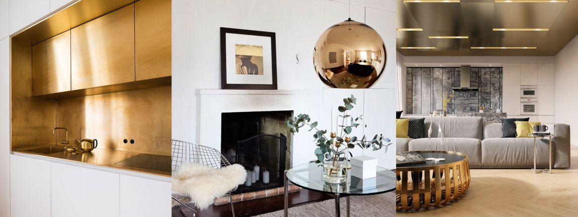 Кухонные фартуки, светильники, мебельные ножки и фурнитура золотистого или медного оттенка добавят яркости любой обстановке.