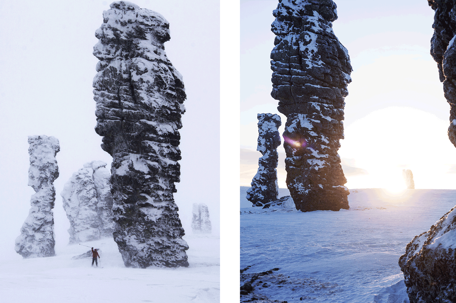 Увиденное впечатляет, никакие фотографии и видеосюжеты не смогут передать живую мощь исполинов… Очень быстро начинаешь верить в реальную силу, чувствовать её, исходящую из этого места. Не случайно это место считается одним из мест Силы. Мнения по поводу лучшего для покорения Маньпупунёра времени года расходятся. Некоторые считают, что прогулку на край света лучше всего совершить зимой, на лыжах. В это время нет комаров, мошки и оводов, болота замерзают, а сами столбы, покрытые инеем, смотрятся невероятно красиво. Да и скорость передвижения на лыжах выше, чем пешком. Минус только один и он очевиден — температура в уральских горах в январе опускается до минуус 40 градусов по Цельсию.