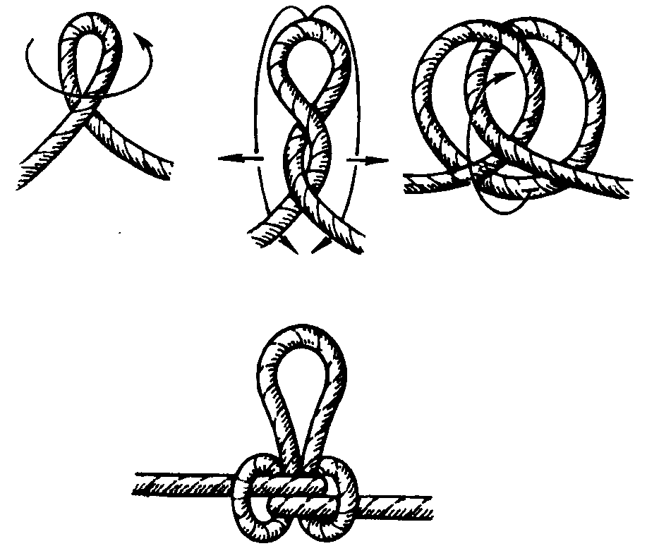 - для привязывания веревок к чему-либо воспользуйтесь «удавкой, стременем» или «булинь»;
