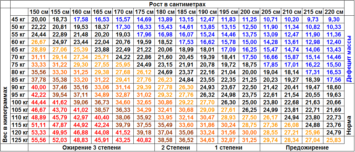Для молодых людей в возрасте 18–25 лет нормальным коэффициентом считается ИМТ, не выходящий за границы 19,5–22,9. Для лиц мужского пола старшей категории – 24–45 лет данный показатель должен быть в интервале 20–25,9.