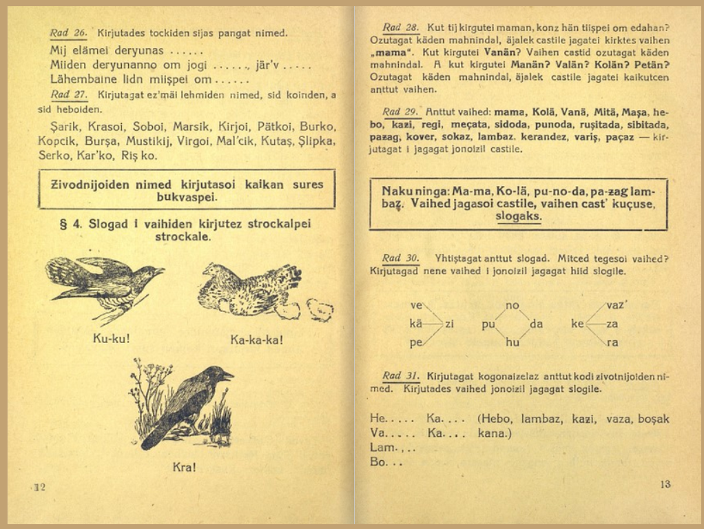Составители книги решили, что латиница наиболее точно отражает фонетическую систему вепсского языка. На практике учебники почти не использовали. В школах вепсский преподавали только в Ленинградской области, и то недолго. В 1937 году начались масштабные репрессии, вепсских интеллигентов посадили в лагеря, учебники изъяли, уроки вепсского в школах запретили. Язык ушел в подполье — на нем говорили только дома.