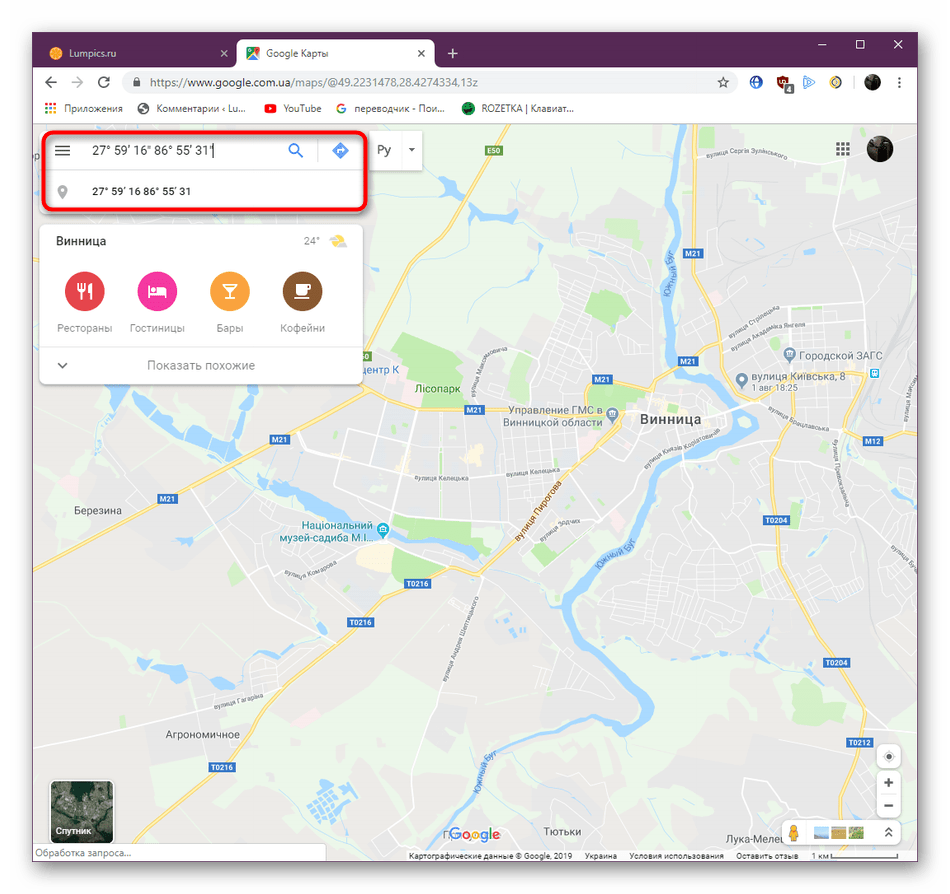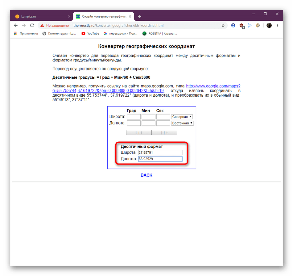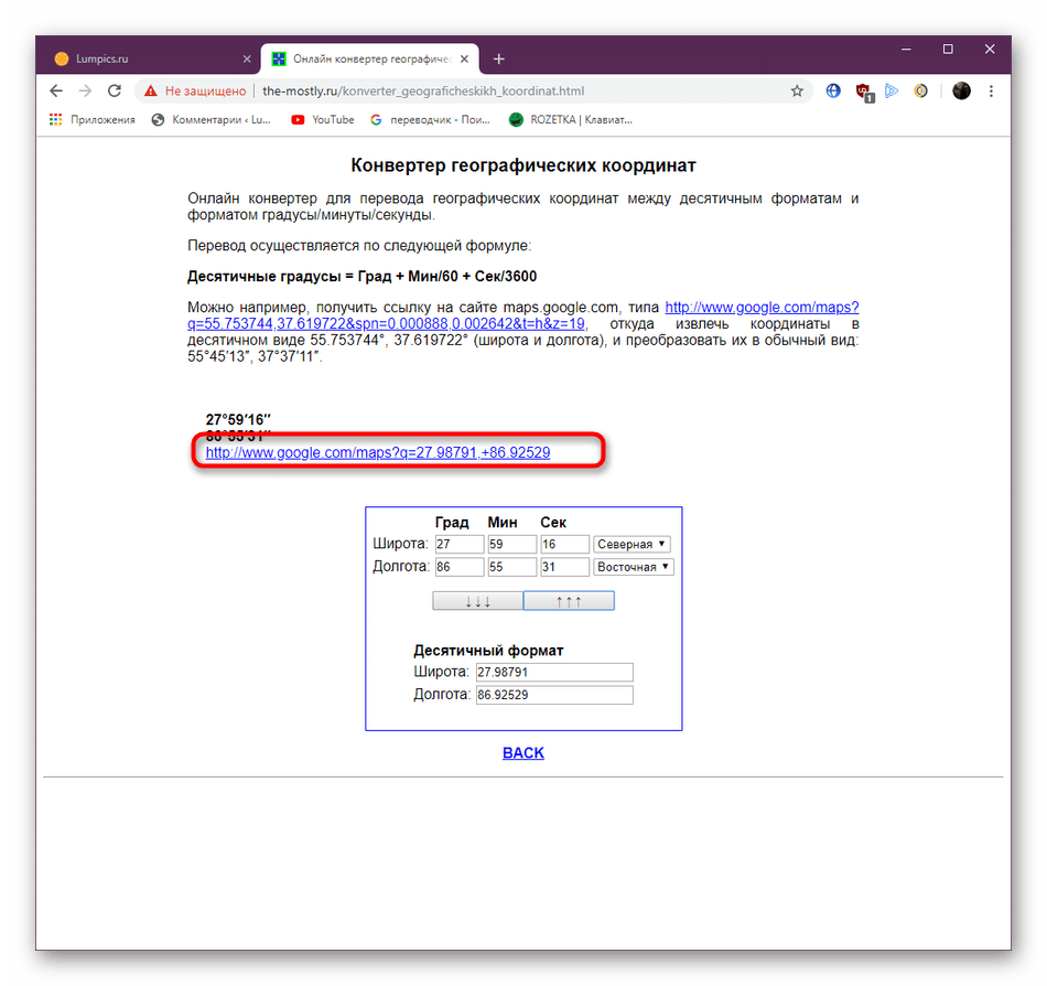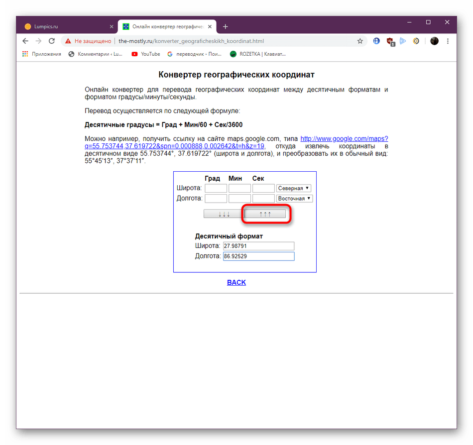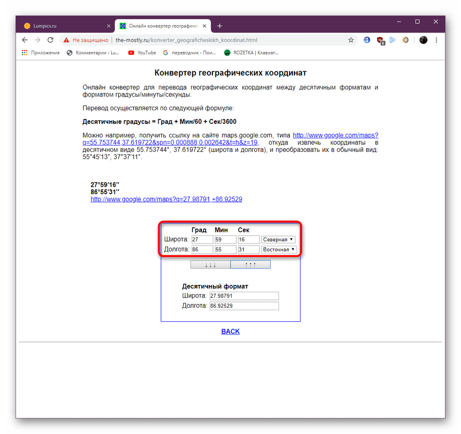 Иногда такие правила приводят к тому, что юзеру перед началом ввода приходится конвертировать имеющиеся значения в один тип, чтобы поиск корректно воспринял указанные координаты. Проще всего для этого задействовать онлайн-сервисы, которые автоматически совершат расчеты. Давайте рассмотрим небольшой пример преобразования.