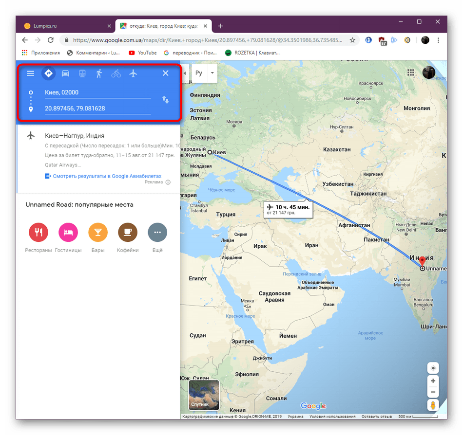 Ничего не мешает также проложить маршрут, указав одну из точек с помощью координат.