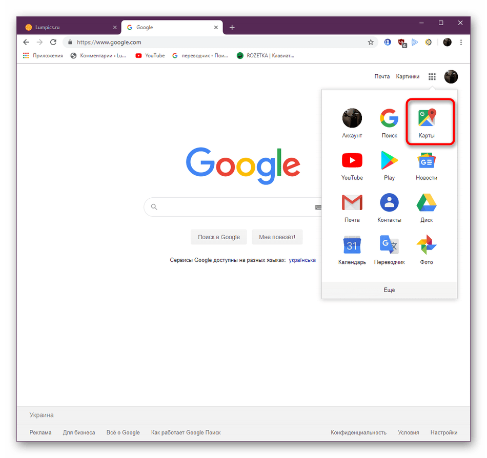 - На главной странице Google перейдите в раздел «Карты», открыв список всех сервисов.