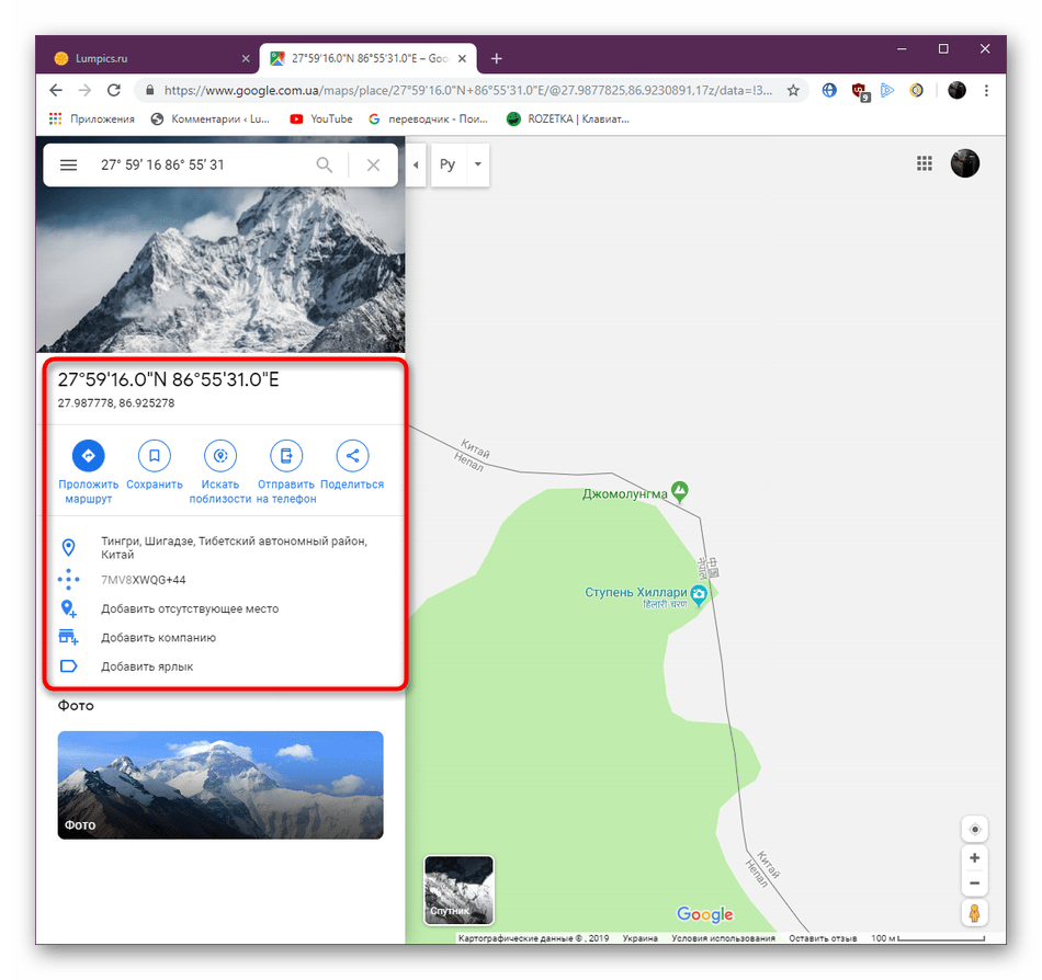 Как видите, ничего сложного в выполнении поиска нет. Здесь главное придерживаться правил ввода и указывать координаты в одном формате. Далее карта самостоятельно предоставит всю необходимую информацию по поводу найденной точки.