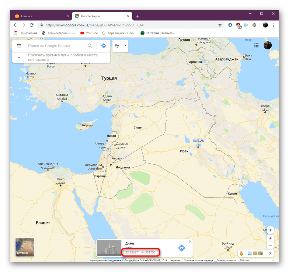 - В поле справа вы можете ввести координаты в привычном вам формате Долгота—Широта и определить местоположение, нажав Ввод.