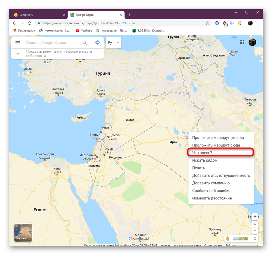 Если требуется узнать координаты любого присутствующего места на карте, просто нажмите на нем правой кнопкой мыши и выберите пункт «Что здесь?».
