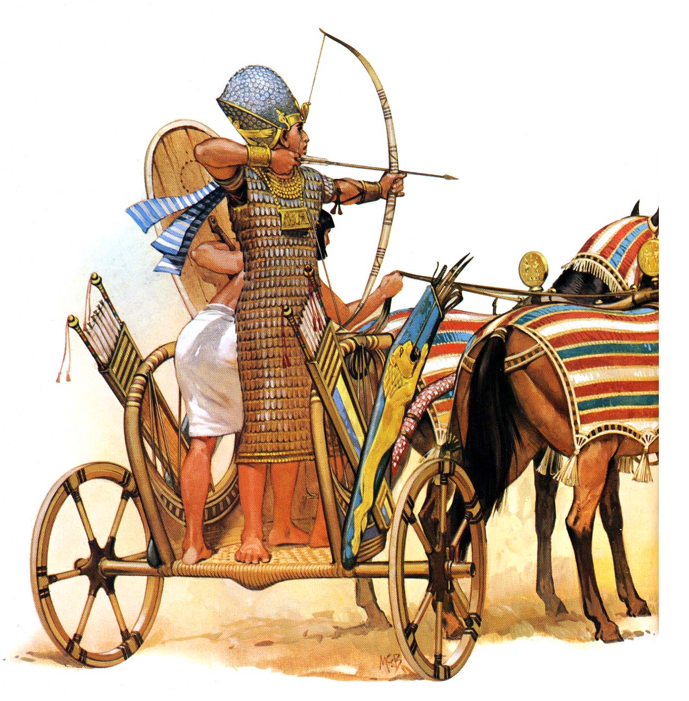Древний Египет не сильно отличался по климату от нынешнего Египта, что накладывало отпечаток на то, какую броню использовали египтяне. Из-за невыносимой жары и относительной дороговизны изготовления даже матерчатых доспехов, простые солдаты почти никогда не носили доспехов. Они использовали щит и носили традиционные египетские парики, которые были выполнены из твердой кожи и часто имели деревянную основу. Это было некое подобие шлема, который мог смягчить удар популярного в то время оружия – булавы или палицы. Бронзовые топоры были достаточно редким оружием, а уж про мечи и говорить не стоит. Такое было по карману только особам, приближенным к Фараону. То же можно сказать и про доспехи, даже из ткани и кожи. За многие годы раскопок почти не было найдено ни одного металлического панциря, что говорит о дороговизне его производства и, возможно, малой эффективности. Визитной карточкой египетской армии, да и многих армий того периода, были конечно же колесницы, поэтому все знатные, хорошо обученные войны сражались верхом на колеснице. В основном выступали они в роли мобильной кавалерии и стреляли из лука. Подобного рода действия требовали немалого умения, в связи с чем воины на колесницах обязательно носили тканевый или кожаный доспех, потому что потеря такого умелого солдата стоила недешево. Не говоря уже о том, что зачастую это были знатные люди.