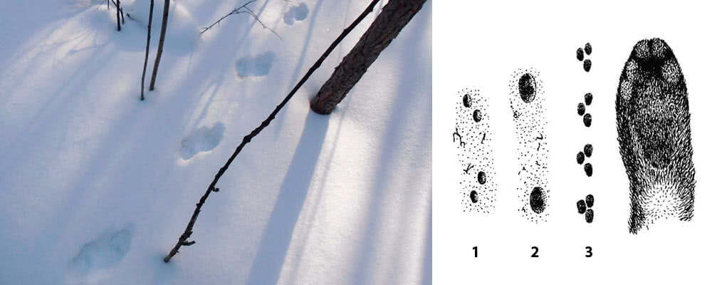 Задняя лапа чуть меньше. На снегу часто отпечатывается пястная мозоль в форме подковы и расположенная прямо за ней запястная мозоль. Первый самый короткий палец передних и задних лап может не отпечатываться на снегу.