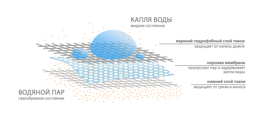 - трехслойные − материалы, представленные эластичным верхом, мембраной и флисом. В таком трехслойном варианте нижний слой отводит испарения и пот, сохраняет тепло, средний передает испарения с влагой внешнему слою, не продувается и не промокает, а внешний выводит влагу, одновременно защищая от ветра и дождя.