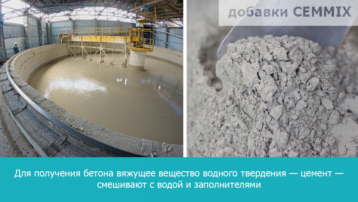 Для получения бетона вяжущее вещество водного твердения — цемент — смешивают с водой и заполнителями. Чтобы запустить реакции гидратации, продуктом которых и является прочный материал с кристаллической структурой (бетон), достаточно водоцементного соотношения, равного 0,3.